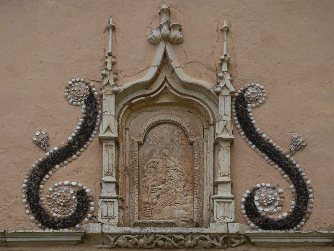 De part et d'autre des portes, on trouve deux autres niches à frontons et pierres apparentes.Au-dessus des portes, une autre niche de style gothique flamboyant abrite une piéta en bas-relief finement ciselée. La niche est entourée de deux S faits eux aussi en coquillages et scories.On notera aussi de faux chaînages d'angle fusionnant avec les deux niches latérales, ainsi qu'un enduis blanc assez abîmé, mais qui jadis devait faire ressortir les détails colorés de la décoration.