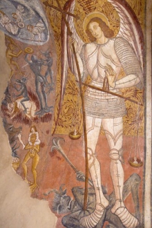 L'intérieur est encore plus formidable. La voûte est divisée en deux parties : à droite, on trouve l'Enfer et les vices, et à gauche le Paradis et les vertus. Au-dessus de la porte, entre Enfer et Paradis, nous trouvons le Purgatoire représenté sous la forme d'une grande cage ouverte dans laquelle s'entassent les âmes en attente de transit. Le thème ici est encore le voyage. Le dernier, celui qui peut se terminer bien ou mal selon que notre vie a été exemplaire ou manifeste de fautes. La fresque représentant l'Enfer est très abîmée : les vices ne sont plus visibles, et seul le combat du Bien contre le Mal a été préservé. On y voit l'Archange Saint Michel terrassant le diable et pesant les âmes des défunts. A côté on aperçoit les démons se livrant à un combat contre les anges lors du Jugement Dernier, ainsi que d'autres démons qui entraînent les damnés vers la gueule du Léviathan. Cette scène n'est pas sans évoquer les célèbres peintures mystiques de Jérôme Bosch.